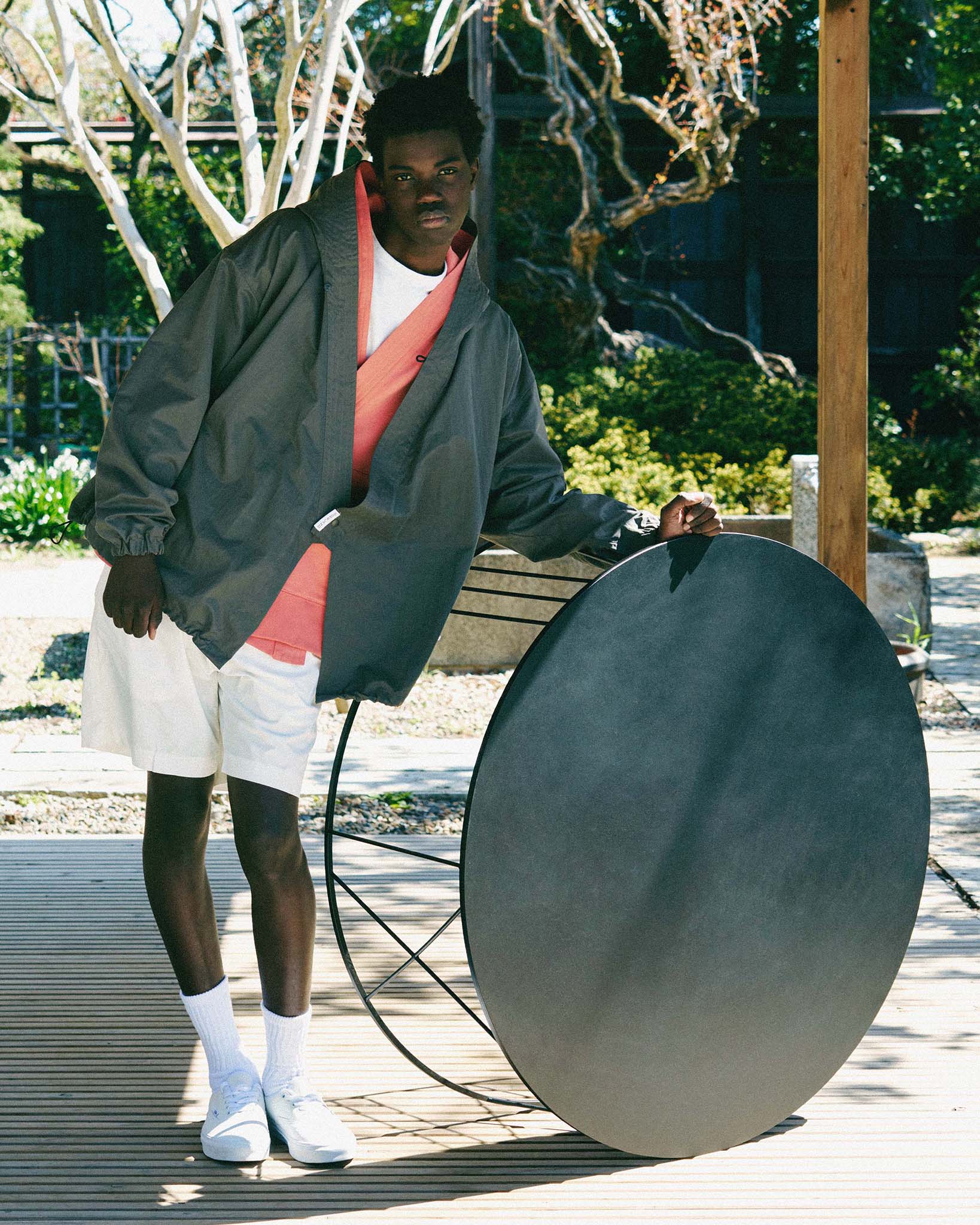 空手着と作務衣を融合させたフード付きジャケット第2弾。今回は防水加工したポリエステルとコットン50%ずつから成る柔らかい生地を使用しています。左右にある2か所のボタンで簡単に着脱でき、胸元にあるボタンやドローコードを使ってさまざまなスタイルを楽しむことができます。
