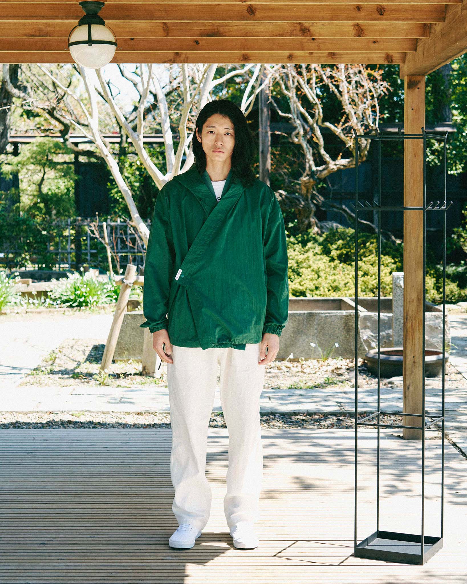 空手着と作務衣を融合させたフード付きジャケット第2弾。今回は防水加工したポリエステルとコットン50%ずつから成る柔らかい生地を使用しています。左右にある2か所のボタンで簡単に着脱でき、胸元にあるボタンやドローコードを使ってさまざまなスタイルを楽しむことができます。