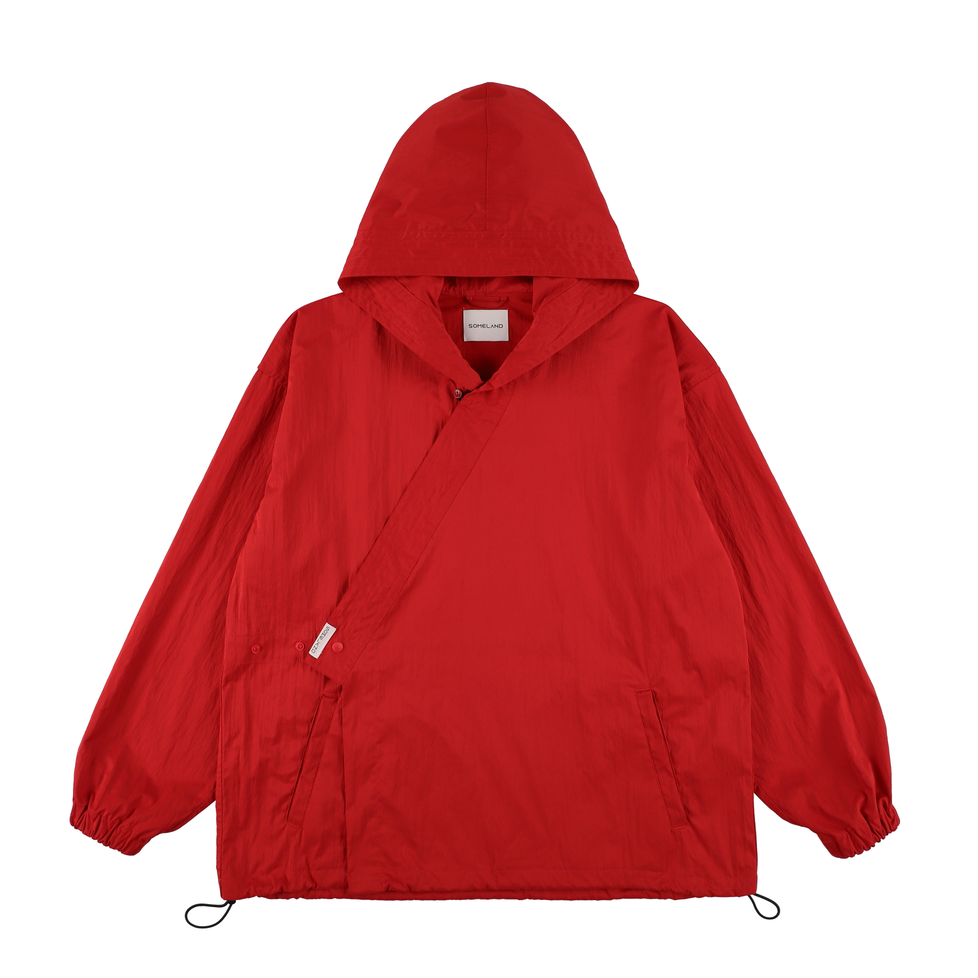 空手着と作務衣を融合させたフード付きジャケット第2弾。今回は防水加工したポリエステルとコットン50%ずつから成る柔らかい生地を使用しています。左右にある2か所のボタンで簡単に着脱でき、胸元にあるボタンやドローコードを使ってさまざまなスタイルを楽しむことができます。